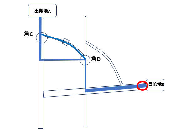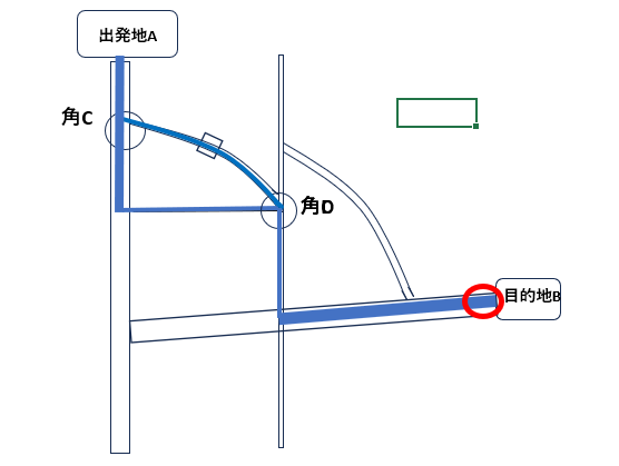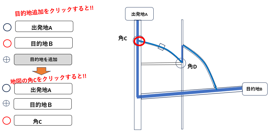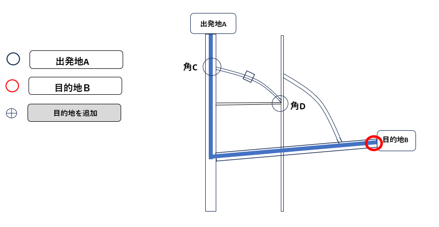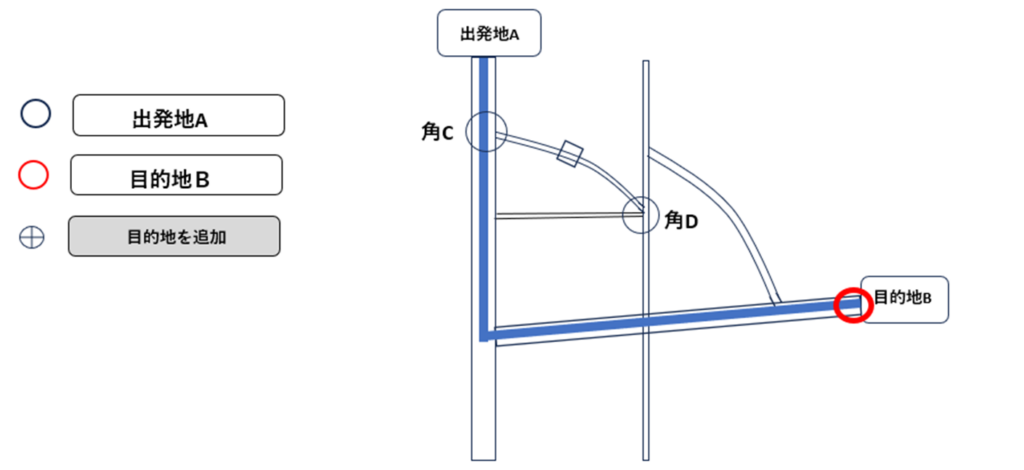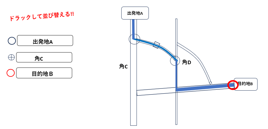 ・最終目的地(C) の順番になるように並べ替えます - 並べ替えた瞬間、角(B)が“経由地”として扱われる